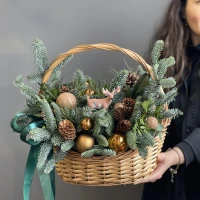 Туя 2шт Нобилис (ель) 4шт Свечи 2шт Новогодние шары 13шт Корзина плетеная 1шт Оазис флористический 2шт